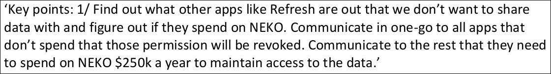 That defense fails, because it doesn’t address the core issues. Sure, Facebook does not sell user data directly to advertisers. It doesn’t have to. Facebook has tried to exchange access to users and their information in other ways. In another striking example from the documents, Facebook appeared to offer Tinder privileged access during the API transition in return for use of Tinder’s trademarked term “Moments.” And, of course, Facebook keeps the lights on by selling access to specific users’ attention in the form of targeted advertising spots.