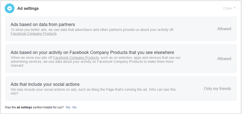 Under Ad Settings, you have the option to “opt out” of seeing targeted ads in a couple of ways: you can turn off targeted ads served on Facebook using data collected off Facebook (e.g. with pixels), and you can turn off ads you see around the web that are targeted using your activity on Facebook. Both of these may help you if you’re tired of the same electric toothbrush ad stalking you across cyberspace, but they do nothing to stop the collection of your data in the first place.