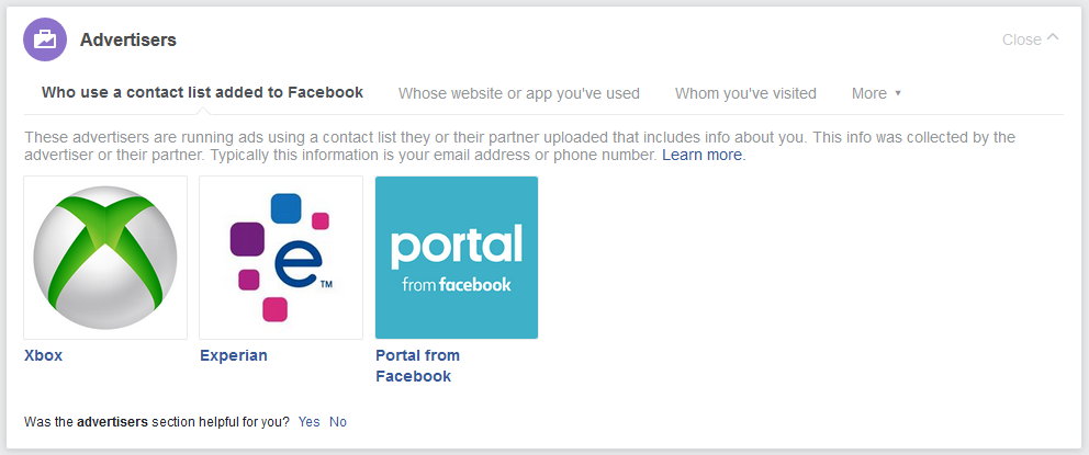 Second, Facebook allows businesses to upload lists of people they want to reach directly with contact information. For example, if a big box store collects email addresses as part of a rewards program, it can tell Facebook to target ads at everyone it has an email for. This also allows advertisers to target people using other sources of data, like publicly-available voter records or lists of names purchased from data brokers. Facebook often processes these data in a hashed or obfuscated form, and maintains that it does not save or use them for any purpose other than this direct targeting. You can see which companies and groups have targeted you in this way under “Advertisers -> Who used a contact list added to Facebook.”