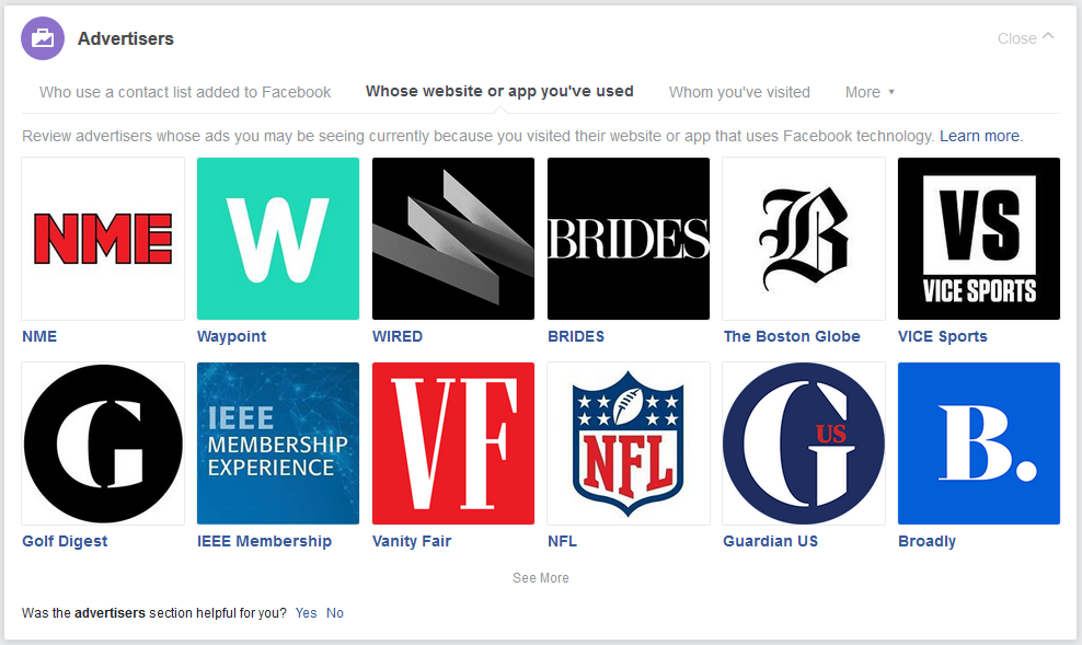 Third, Facebook tracks your activity on the rest of the internet. Thanks to tech like pixel tracking and Facebook’s third-party ad network, Facebook can track a great deal of your activity on other websites and in different apps on your phone. According to our own research, Facebook has pixels or other cookie-sharing code on about 30% of the top 10,000 sites on the web. And according to its own marketing literature, the company’s tracking tech is used in 32% of the top 500 android apps and reaches 1 billion people per month. Under “Whose website or app you’ve visited,” you can see a list of the advertisers Facebook believes you’ve interacted with in this way. The data recorded here may include activity from any device or browser you’ve used to log in to Facebook in the past, so some of it might not actually be yours.