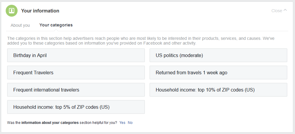 We don’t know what goes into determining your “categories,” but it is likely grounded in the more concrete data the company knows about you: what you “like,” what third-party websites and apps you use, and the physical location of your smartphone and your computer. Facebook allows advertisers to target you based on any one of these categories of data, as well as by more nebulous metrics like “similarity” to other users. Though you might not know it, much of this data is visible to average users in the Ad Preferences page. In this post, we’ll go through each category of data to explain where it comes from and what it means.