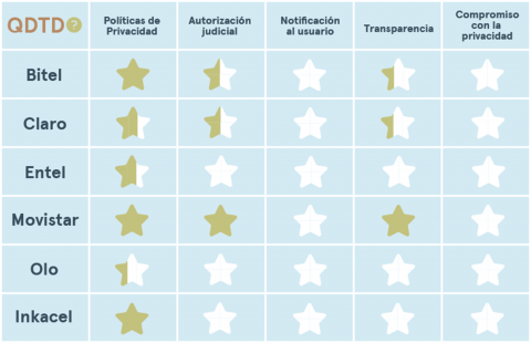 This latest report awards more stars than the first edition, which was published in 2015. Now, five out of the six ISPs have published their policies with specific information about the collection and processing of personal data. However, Claro and Entel provide this information using highly technical language, which reduced their score. In order to earn a full star, the information provided must be easily understandable, otherwise it is just a formal measure, with little to no effect in empowering users to fight for their rights. Still, all companies detail how long and for which purposes users’ data is stored. Even Olo, which doesn’t publish a privacy policy, added this information to its regular service provision agreement.