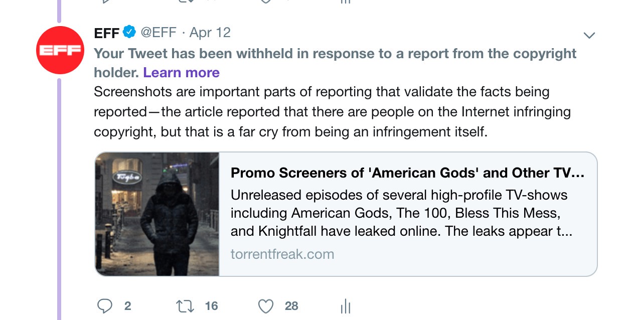 Get ready for a tale as good as anything you’d see on television. Here’s the sequence of events: the website TorrentFreak publishes an article about a leak of TV episodes, including shows from the network Starz. TorrentFreak tweets its article, Starz sends a copyright takedown notice. TorrentFreak writes about the takedown, including a comment from EFF. EFF tweets the article about the takedown and the original article. EFF’s tweet…gets hit with a takedown.