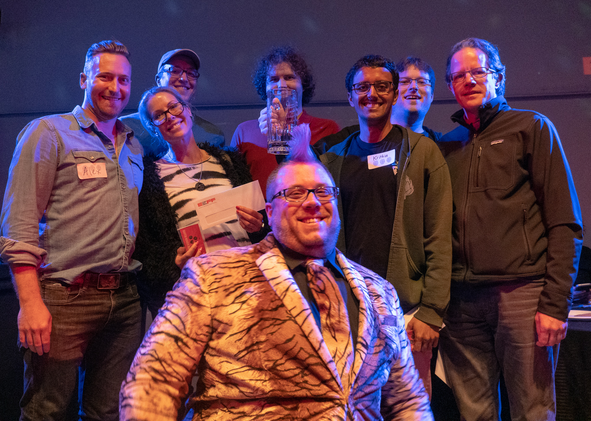 Last week, EFF’s Cooper “Cybertiger” Quintin led three judges and eleven teams in five challenging (and comic) rounds of tech trivia, covering everything from fictional search engines in television to historical messaging protocols to ancient cryptography methods. The tensions were high, and the stakes were higher: three winners would come away with EFF prize packs, championship trophies (in the shape of oversized Tech Trivia beer tankards), and all of the glory.