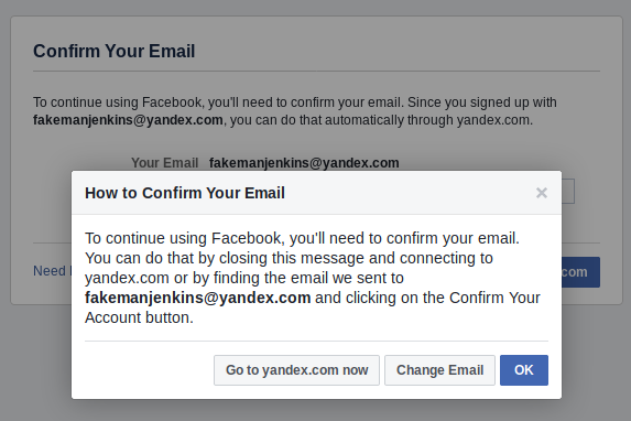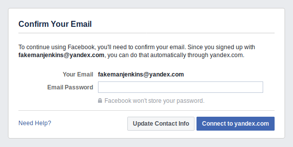 Last weekend, news broke that Facebook has been demanding some new users enter their email passwords in order to sign up for an account on the site. First publicized by cybersecurity specialist e-sushi on Twitter, the unnervingly phishing-like process worked like this: any user who tried to create a new account on Facebook with an email from one of a few providers (including Yandex and GMX) was directed to a page that asked them to “Confirm [Their] Email”--by entering their email password.