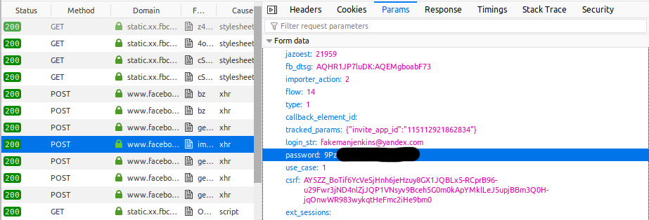 Firefox’s developer tools show a request being sent to Facebook with our (fake) email password in it.