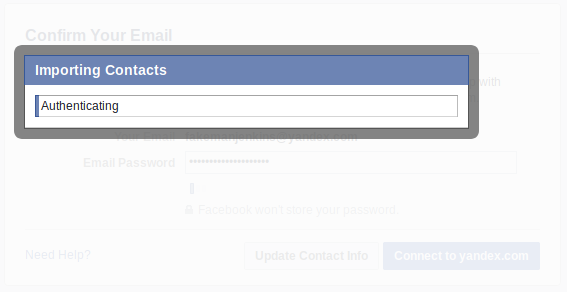 When we clicked “Connect to yandex.com,” an overlay with a status bar appeared. “Authenticating,” it said. But wait—“Importing contacts?” When did that happen? What? How? Why??