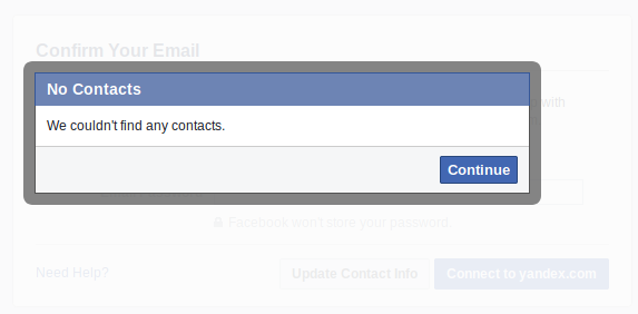 This tool worked the first time we tried it, on April 2, but by April 3, after the story had broken, every email we entered (including the Yandex one) prompted a “can't import contacts from this address yet” message. For now, it appears that Facebook may have shut down the “Find Friends” program as well.