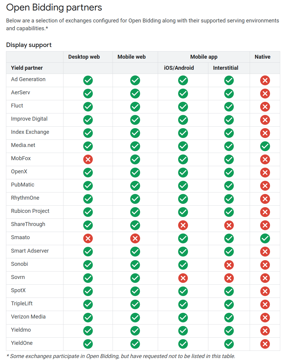 A partial list of the ad exchanges that Google shares data with through AdMob Open Bidding.