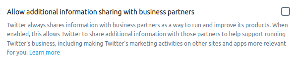 Twitter has changed what happens when users opt out of the “Allow additional information sharing with business partners” setting in the “Personalization and Data” part of its site.