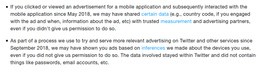 On August 5, 2019, Twitter announced that it had identified and fixed a couple of bugs. As it turned out, some of its privacy settings were... not setting things correctly. Specifically, the opt-outs for device-level targeting and conversion tracking—the same conversion tracking described above—did not actually opt users out. Twitter explained at the time: