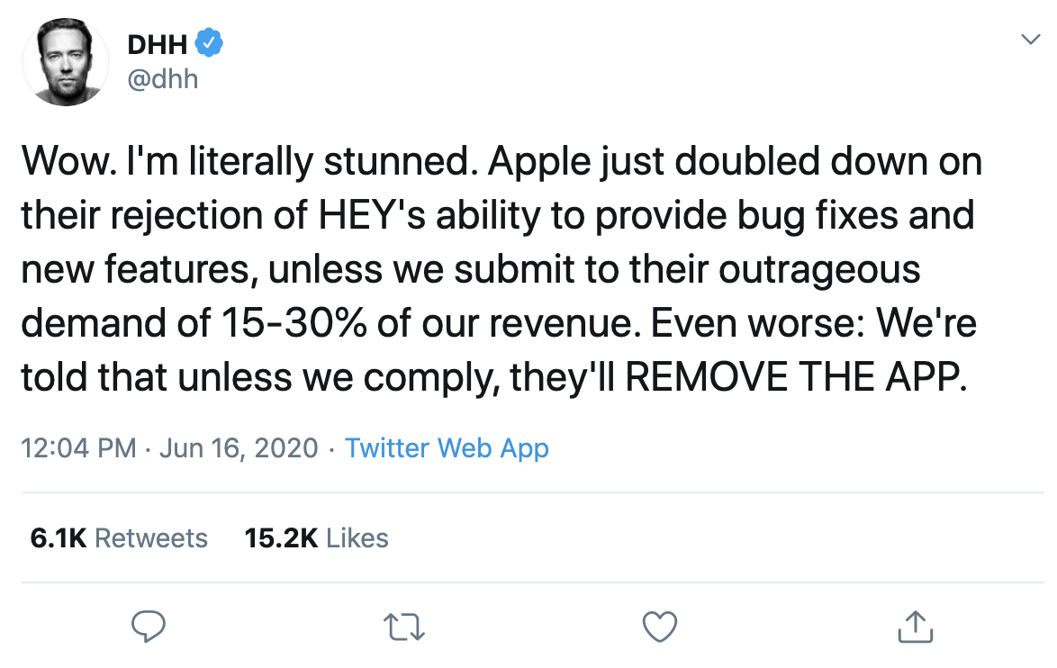 HEY announced that they had found a way forward: negative publicity and public pressure pushed Apple to keep HEY in the App Store, at least for now. Apple agreed to allow the new version of HEY with its security fixes, and HEY is seeking to release a new version of the app they hope will be more palatable to Apple long-term.
