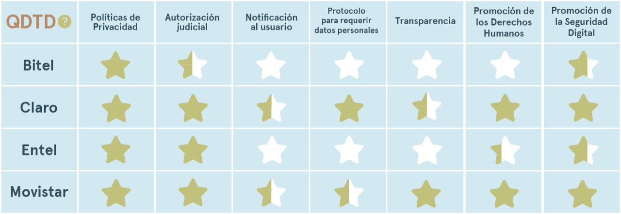 We are glad to see that Peru’s third report shows significant progress, but much needed to be done to protect users’ privacy. Entel and Bitel have to catch up with the larger regional providers. And Movistar and Claro can also go further to complete their chart of stars. Hiperderecho will remain vigilant through their ¿Quien Defiende Tus Datos? Reports.
