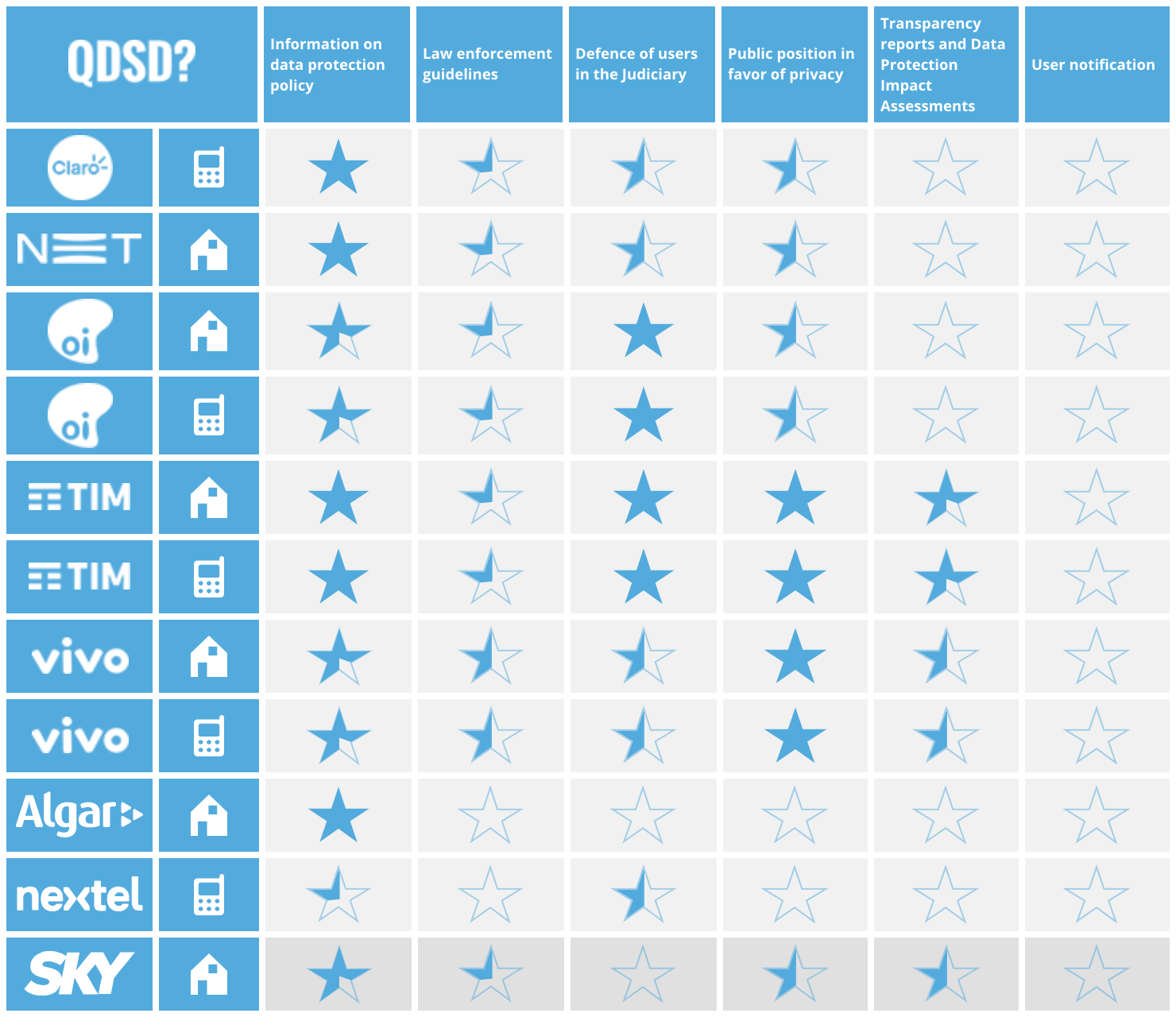 In stark contrast to InternetLab’s first report in 2016, half of the covered providers (Claro, NET, TIM, and Algar) have made significant progress in the data protection category. After being poorly rated in 2019, Algar obtained a full star this year in this category, a positive change as Brazil starts embracing its new GDPR-inspired data protection law.