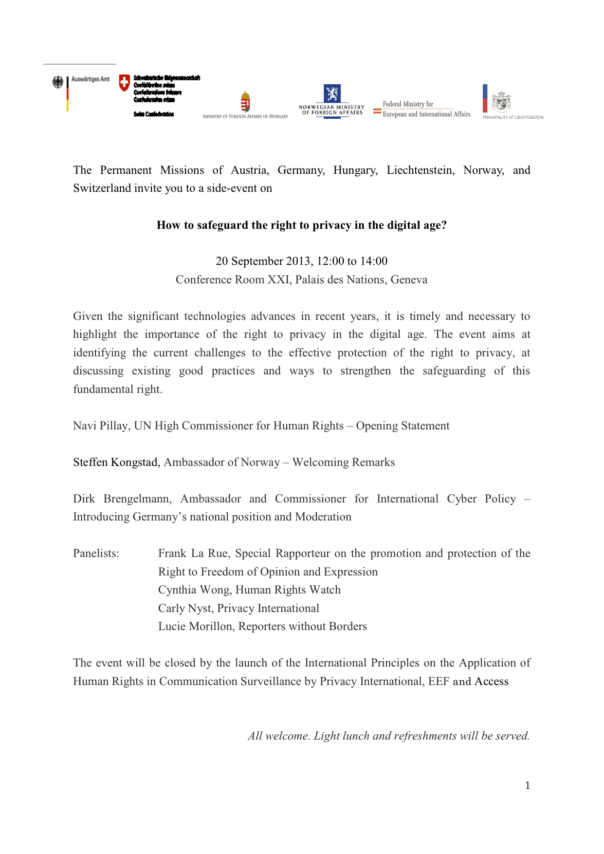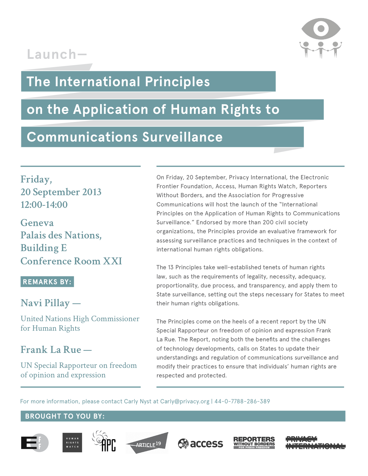 On Friday, 20 September 2013, the government of Austria, Germany, Liechtenstein, Norway, Switzerland and Hungary are organizing a side event at the 24th session of the Human Rights Council on how to protect the right to privacy in the digital age. Frank La Rue, Special Rapporteur on Freedom of Expression and Opinion, Carly Nyst from Privacy International, Cynthia Wong from Human Rights Watch and Lucie Morillon from Reporters Without Borders will be speaking at the event. The event will be closed by the launch of the “International Principles on the Application of Human Rights to Communications Surveillance,” presented by Privacy International, the Electronic Frontier Foundation and Access. EFF International Rights Director, Katitza Rodriguez and Access Policy Counsel Fabiola Carrion will be introducing the 13 Principles to the audience.