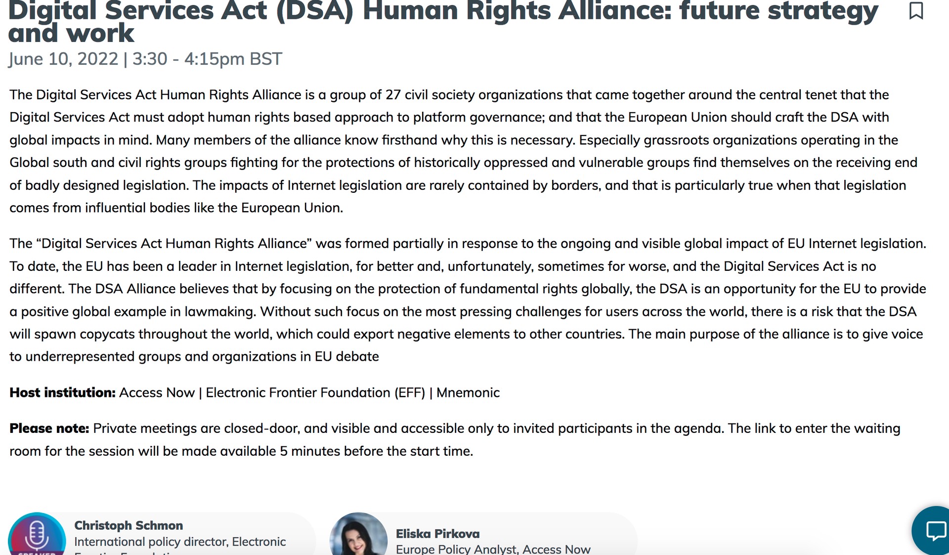 Christoph Schmon, EFF's international policy director, is speaking about the DSA Human Rights Alliance and its efforts to ensure the DSA adopts human rights based approaches to platform governance with global impacts in mind.